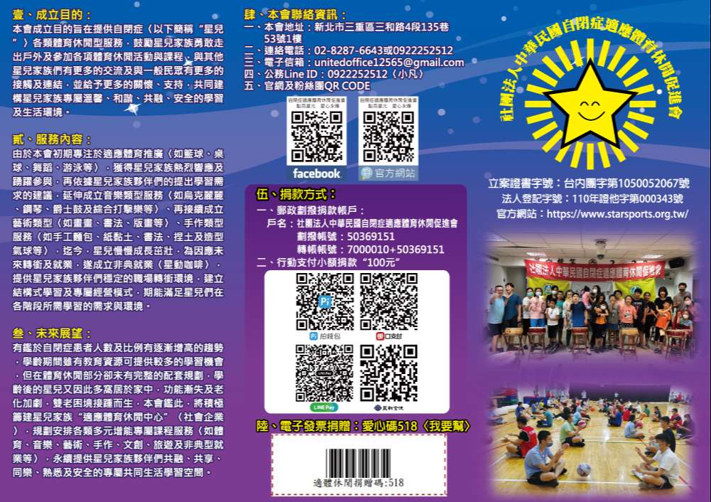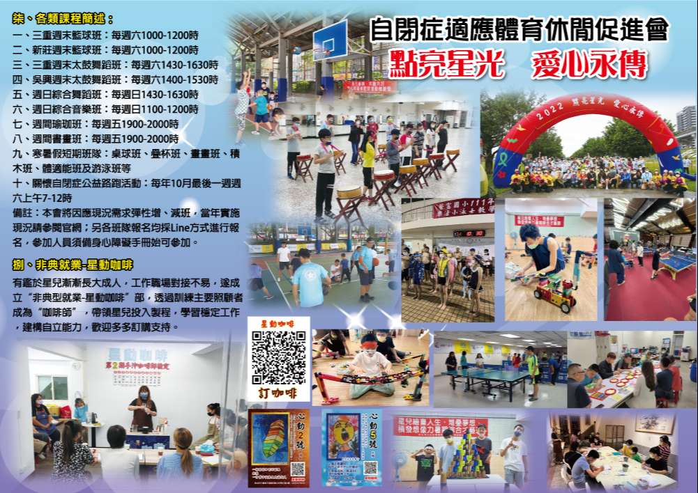 二、本會長期致力於自閉症者〈以下簡稱“星兒”〉各項體育 〈籃球、桌球、水適能、舞蹈等〉及休閒〈藝術創作、音樂培養、手作工藝等〉等服務,期能提供星兒家庭專屬合適的學習環境,不斷成長〈簡介單張如附件〉。