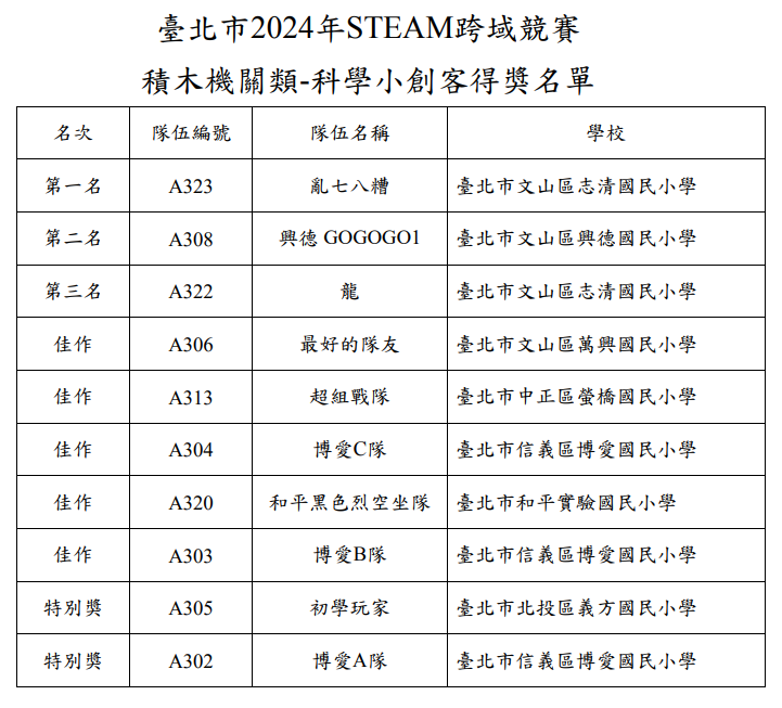 賀!本校四年二班林則辰、劉語霏參加臺北市2024年STEAM跨域競賽積木機關類-科學小創客項目
