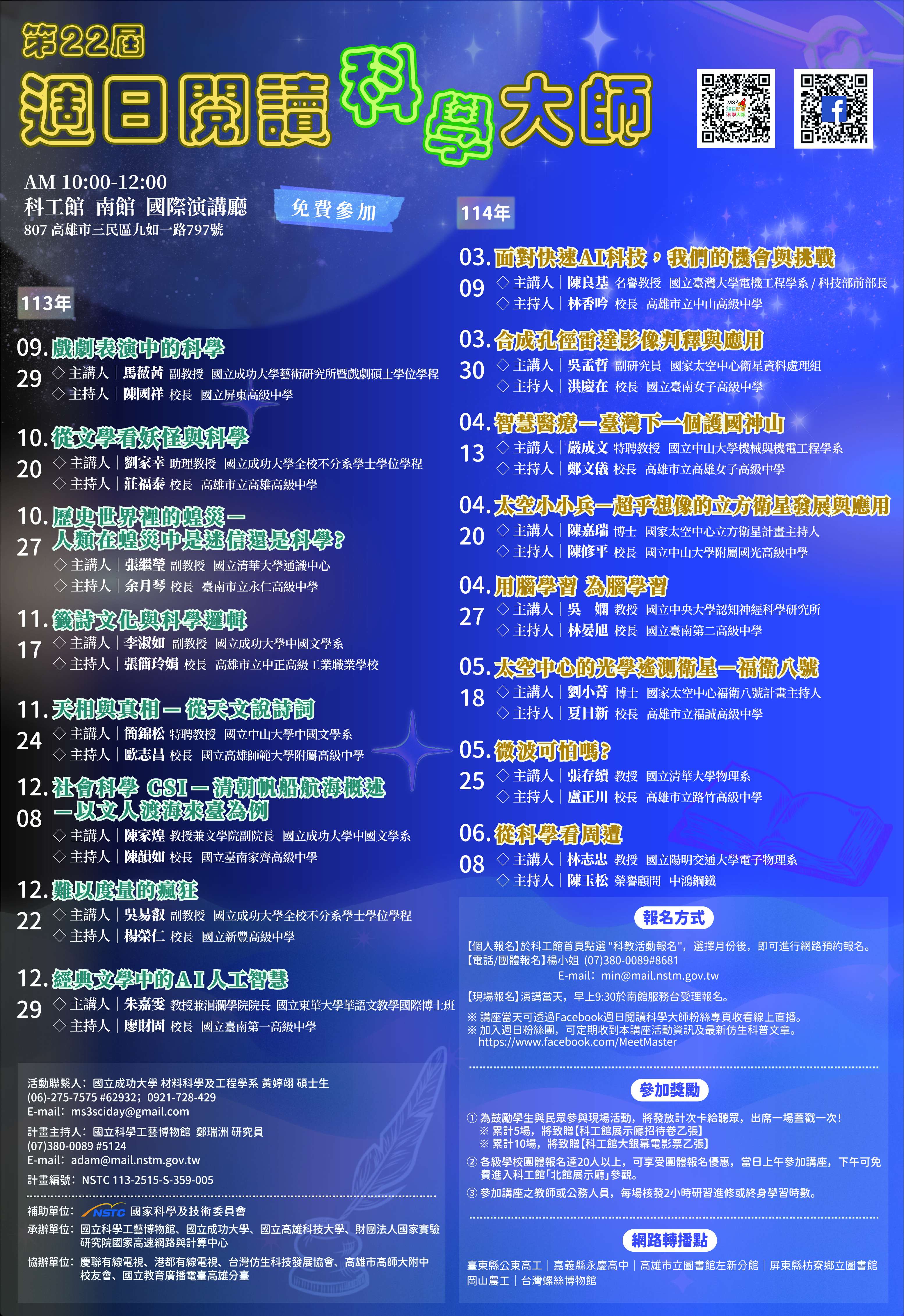 二、講座為免費入場,辦理地點為國立科學工藝博物館南館國際演講廳,每場講座核發參加教師2小時研習時數,參加公務人員核予2