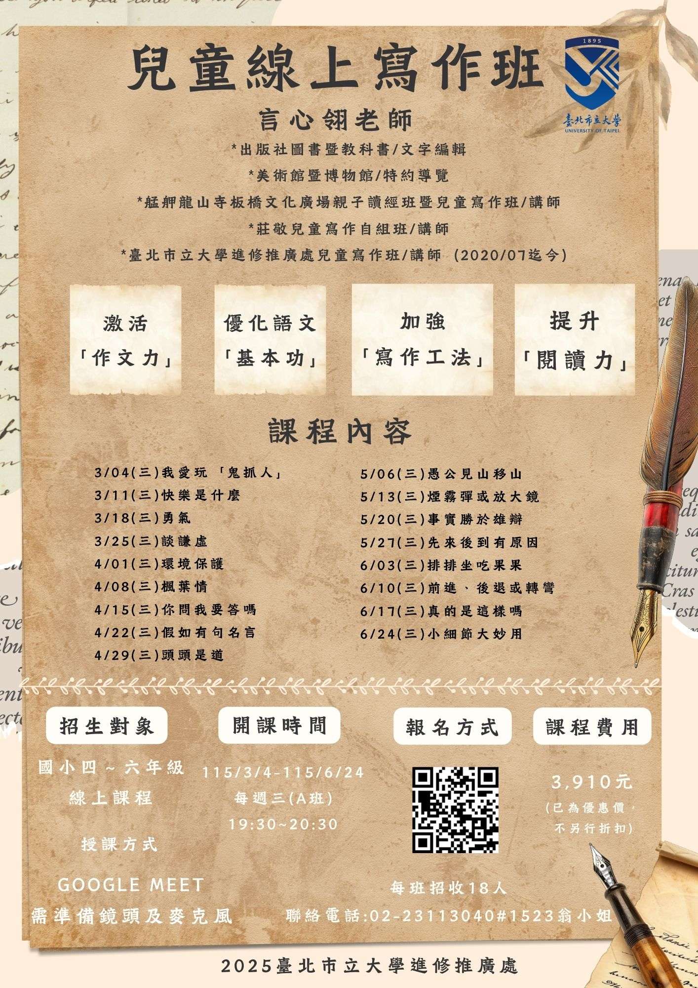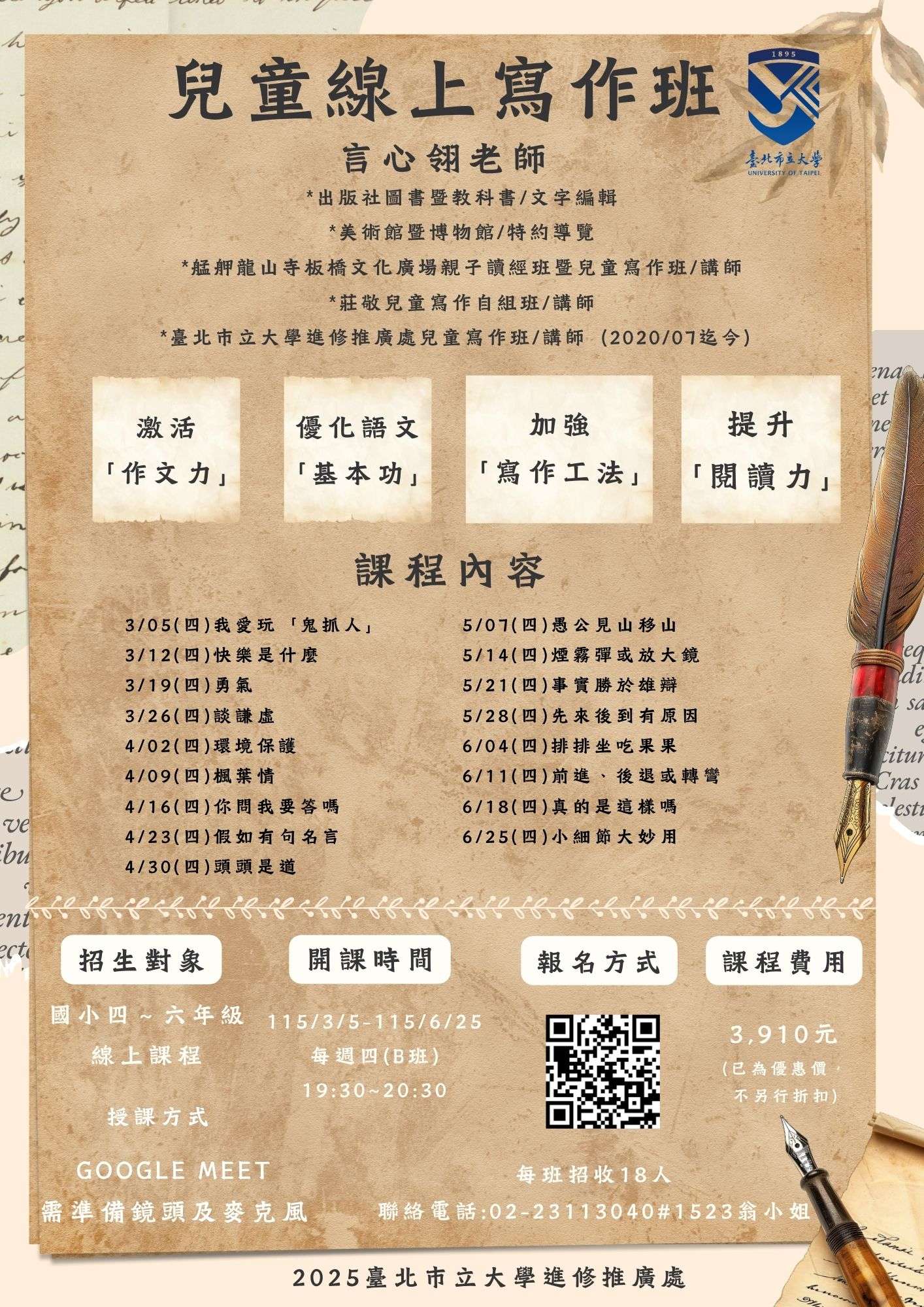 二、課程時間:115年3月4日至115年6月25日,每週三A班及週四B班。