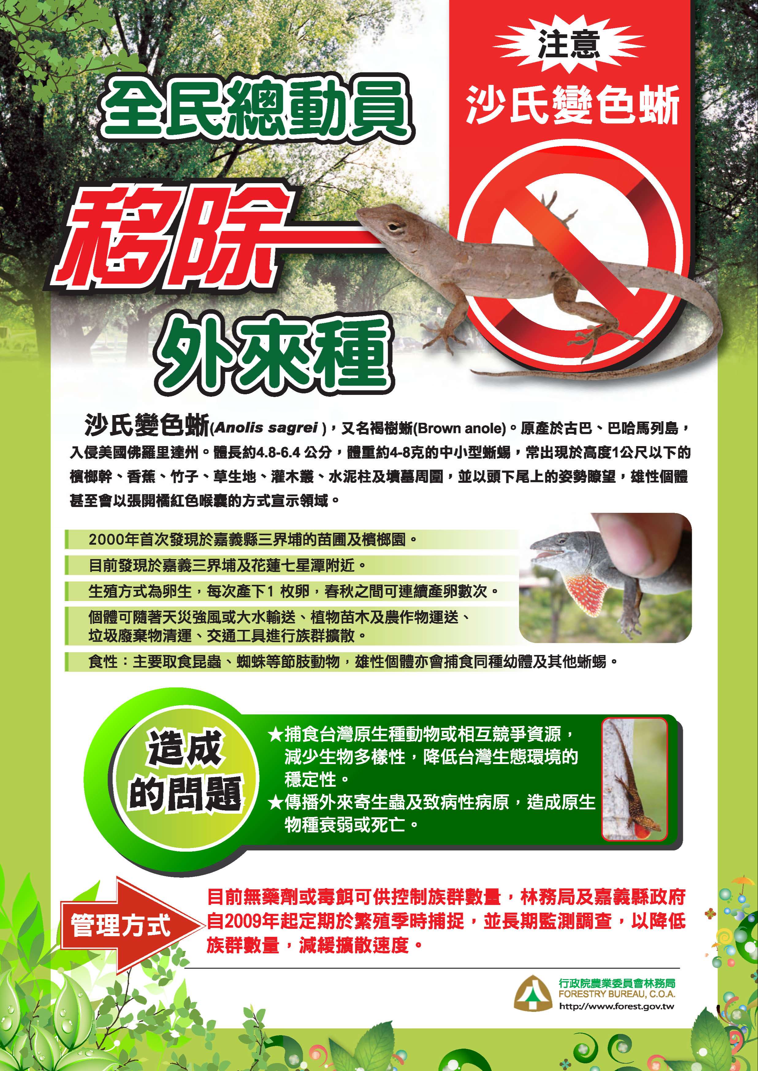 二、由緣民眾陳情表示於旨揭地點發現外來入侵種沙氏變色 蜥(詳附件文宣),查該物種已於嘉南地區生態造成危害, 並可能隨園藝苗木移動而擴散,對本土原生生態造成影響。請各機關與民眾留意該外來種之蹤跡,倘發現可逕自捕捉或通報本處處理。