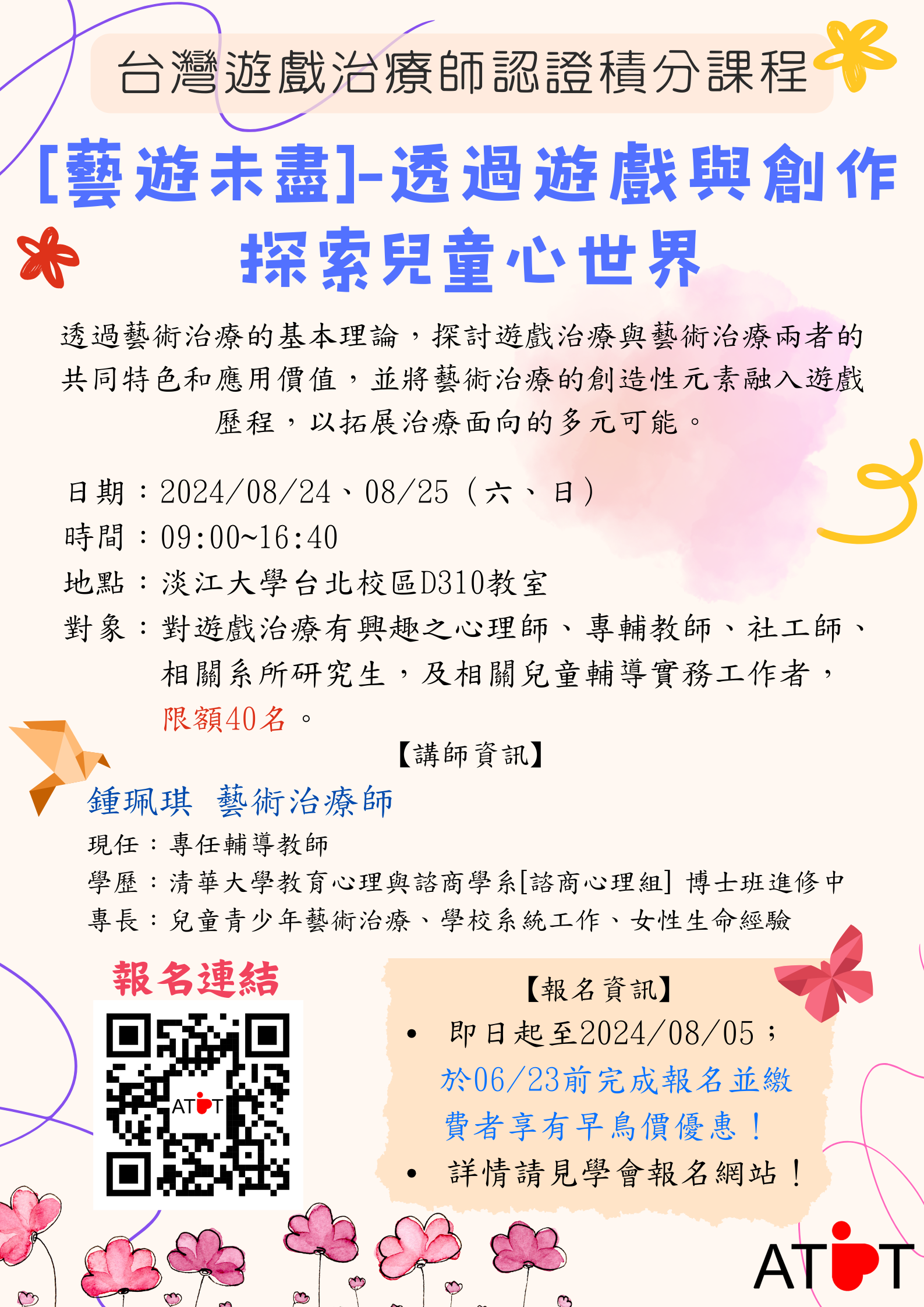 2024台灣遊戲治療師認證積分課程【2024台灣遊戲治療師認證積分課程】:「藝遊未盡-透過遊戲與創作探索兒童心世界」課程時間及講師資訊。
