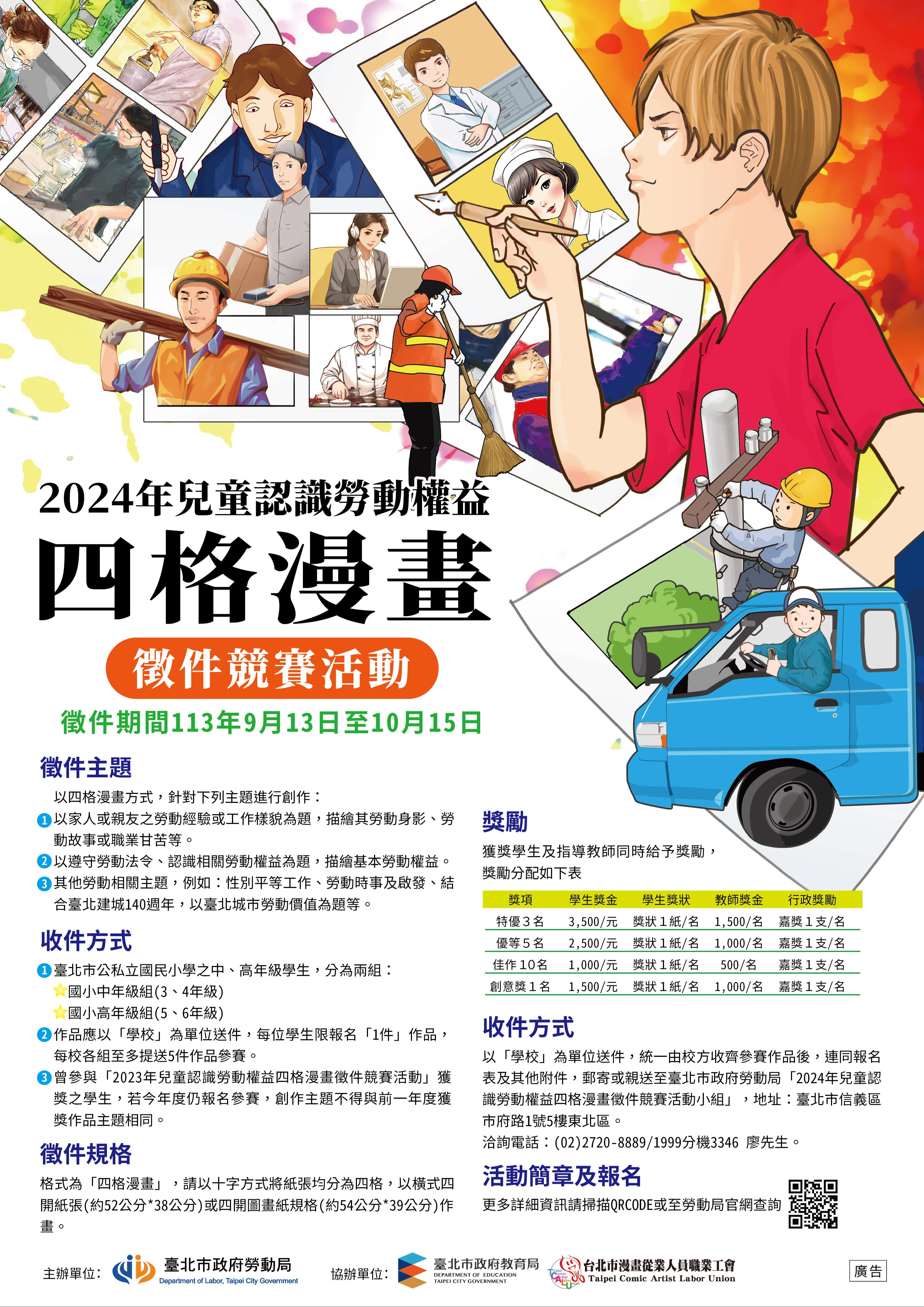 三、詳細競賽內容及送件方式請參閱活動簡章(如附件2),亦可至本局官網瀏覽及下載(路徑:臺北市政府勞動局/業務服務/勞動教育文化/勞動教育/兒童認識勞動權益四格漫畫
