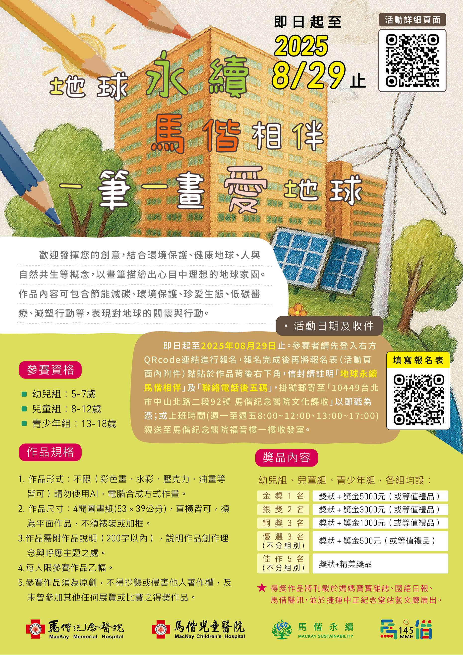 一、2025年適逢馬偕醫療體系145週年,秉持馬偕博士「寧願燒 盡,不願鏽壞」的精神,我們除了關懷人的健康,也關心 地球的健康。為呼應全球永續發展目標(SDGs),特舉辦 「地球永續 馬偕相伴」繪畫比賽,鼓勵大小朋友透過畫筆 展現守護地球的創意,發揮環保愛地球的行動力。