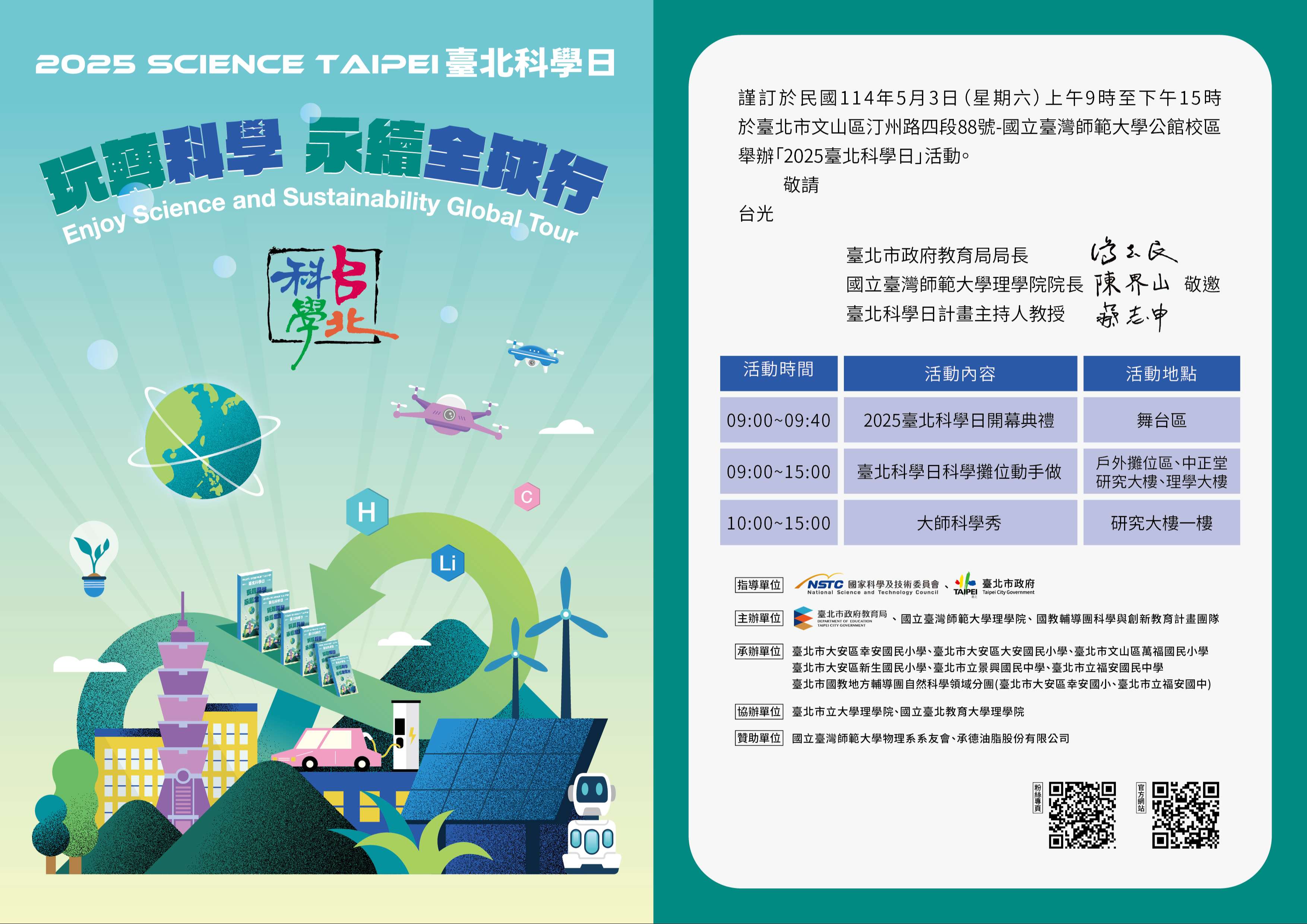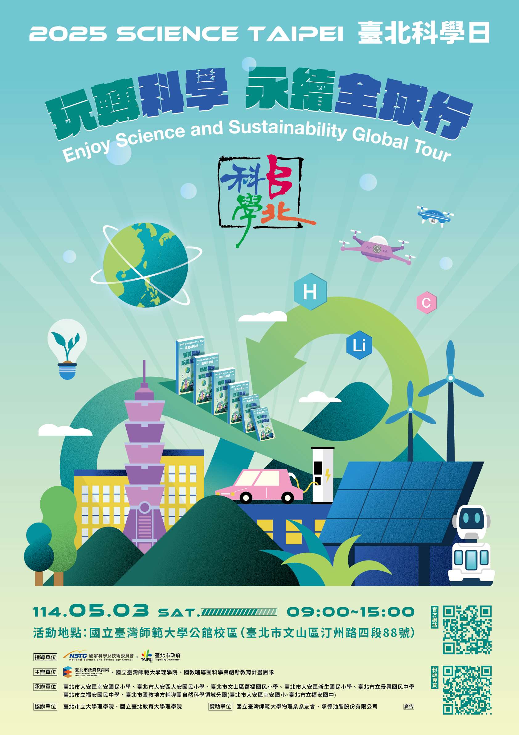 二、旨案係由本局與國立臺灣師範大學理學院物理學系合作舉辦,本年度將於114年5月3日(星期六)假師大公館校區辦理科學體驗實作活動,並響應聯合國教育科學及文化組織「永續發展國際十年(IDSSD)」理念,藉本活動「玩轉科學-永續全球行」之主題,彰顯本市對於推動科學教育的重