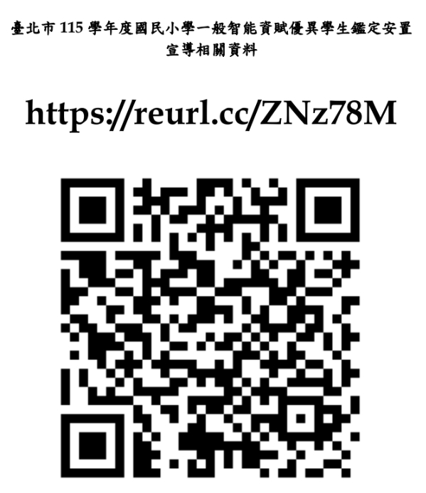 臺北市115學年度國民小學一般智能資賦優異學生鑑定安置宣導相關資料:https://reurl.cc/ZNz78M