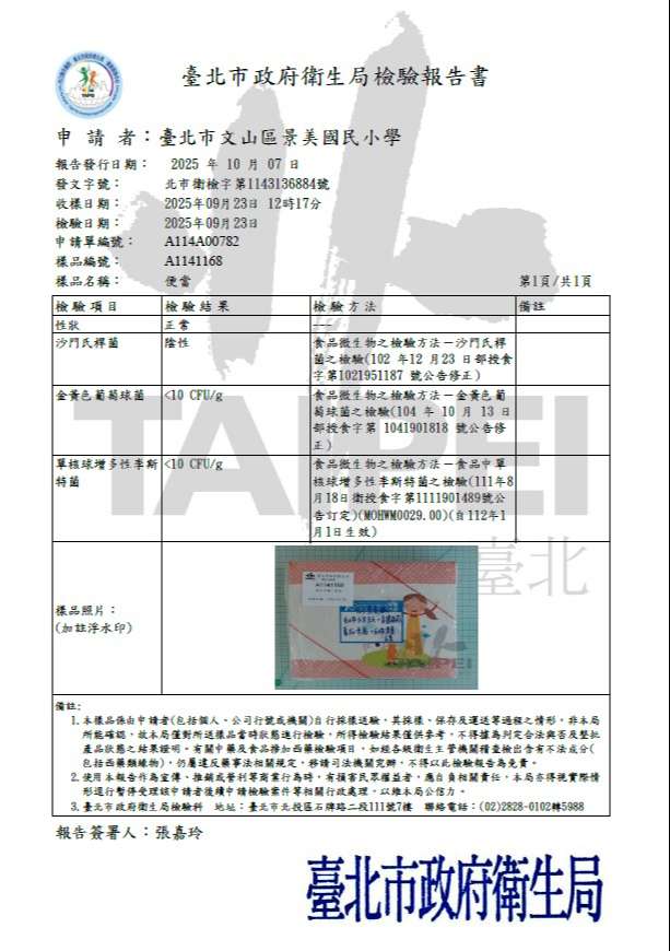 本校隸屬於景美國小午餐群組,於9月23日送檢當日餐食,檢驗解果:合格!
