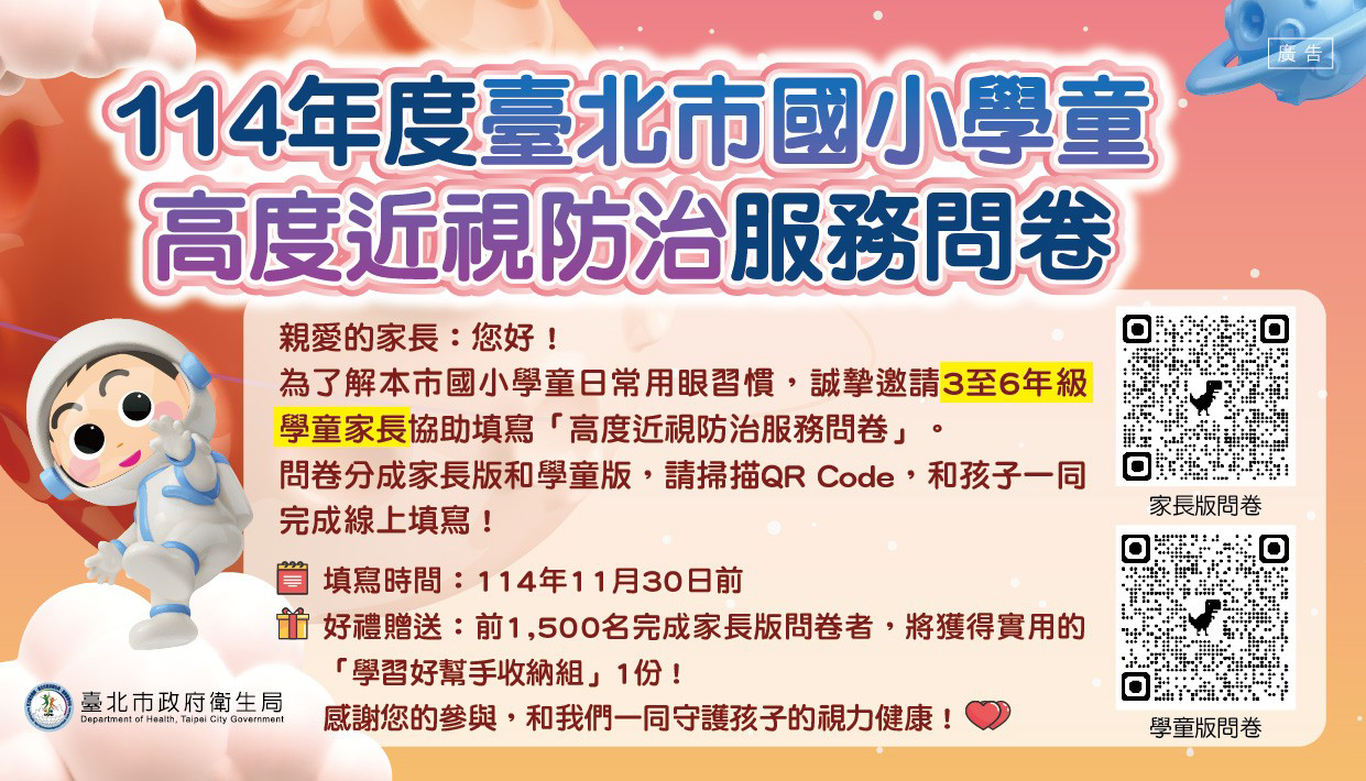 二、衛生局與教育局共同推動辦理「臺北市學童高度近視防 治服務」,提供設籍或就讀臺北市國小1至6年級學童,持 護眼護照(或護眼卡)至眼科合約醫療院所,可享有每年1 次專業視力檢查補助,協助家長及學童建立規律檢查習 慣,掌握視力狀況。為進一步了解本市國小學童日常用眼 情形,今(114)年特委託國立臺灣大學辦理相關問卷 調查,作為研擬兒童近視防治策略之參考。