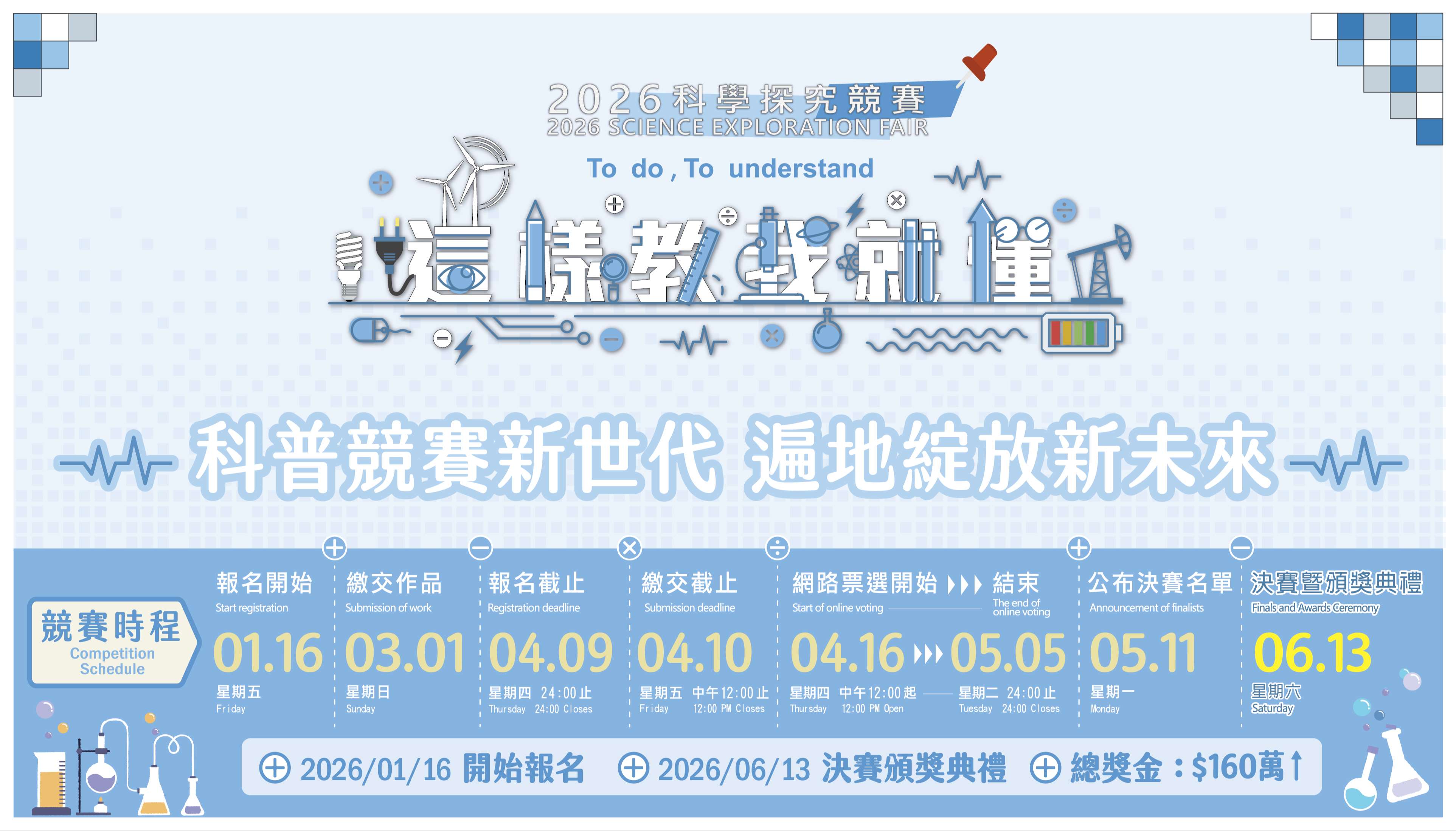 八、報名資訊、競賽方式與獎勵等相關資料請參閱附件或計畫網站(官網:https://sciexplore2026.colife.org.tw;粉絲專頁:https://www.facebook.com